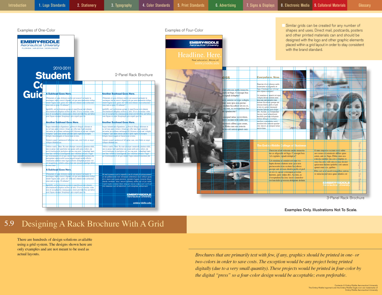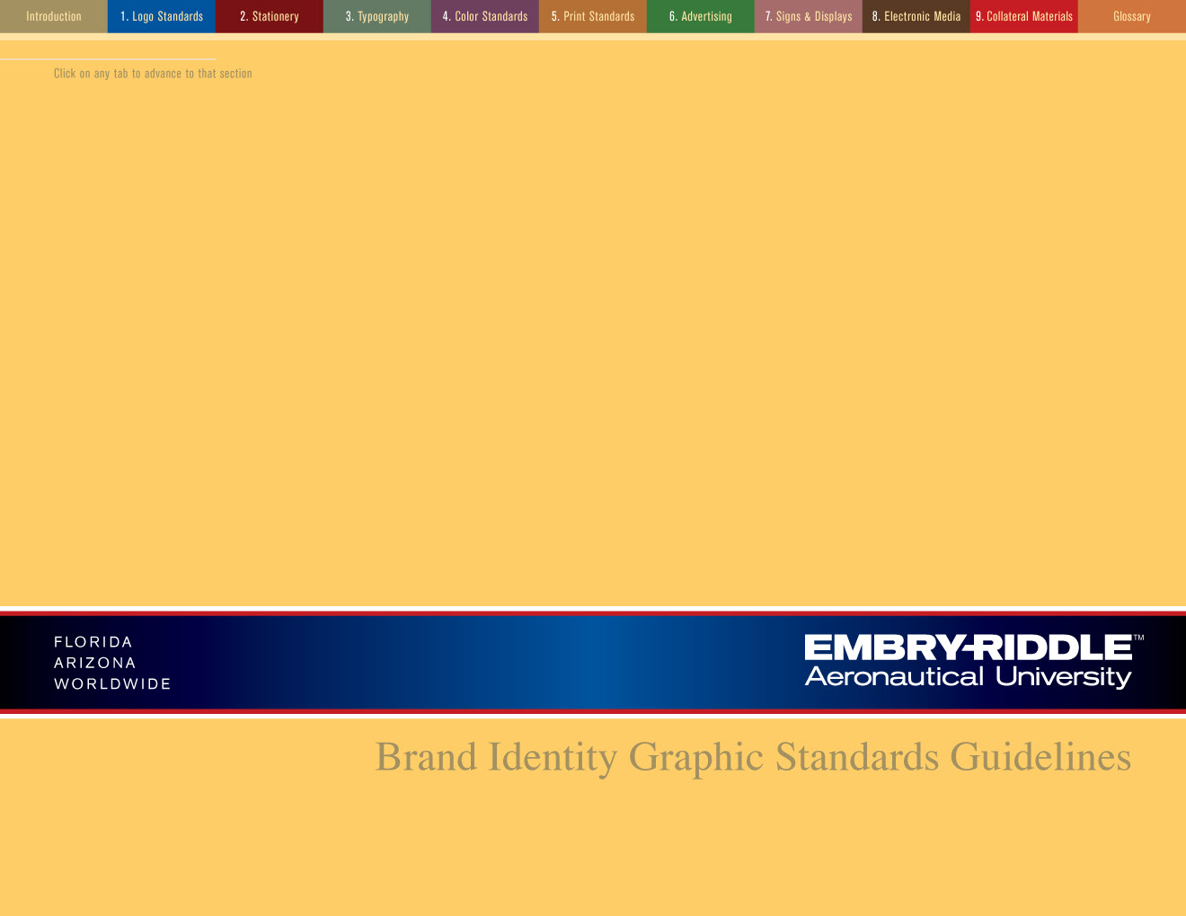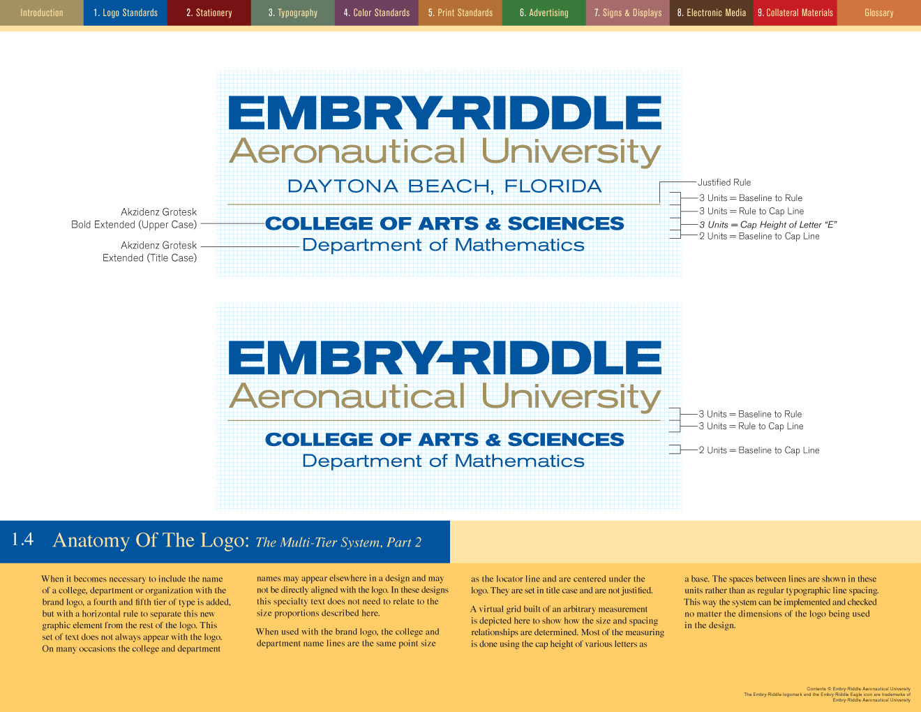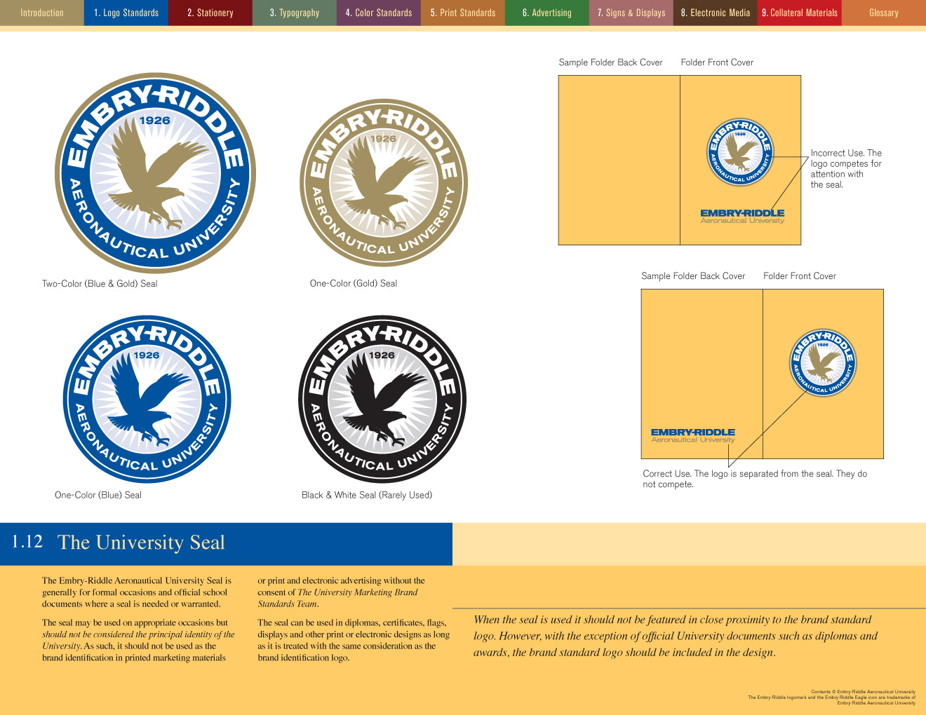 It took nearly three months to write and design the brand standards manual for Embry-Riddle Aeronautical University. At one point it was up to nearly 96 pages but after some judicious editing the client and I got it down to a mere 84. The manual was planned for both print—at landscape letterhead size—and as an interactive PDF. Clicking on the colored navigation at the top of the page jumped the reader to the first page of that section. The Table of Contents also provided click-through navigation. Below are just a few sample pages...