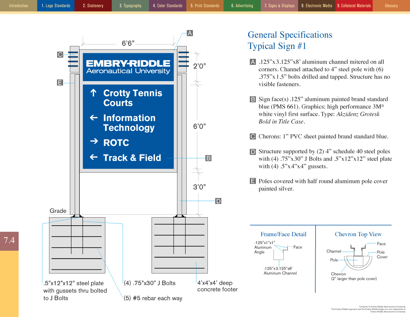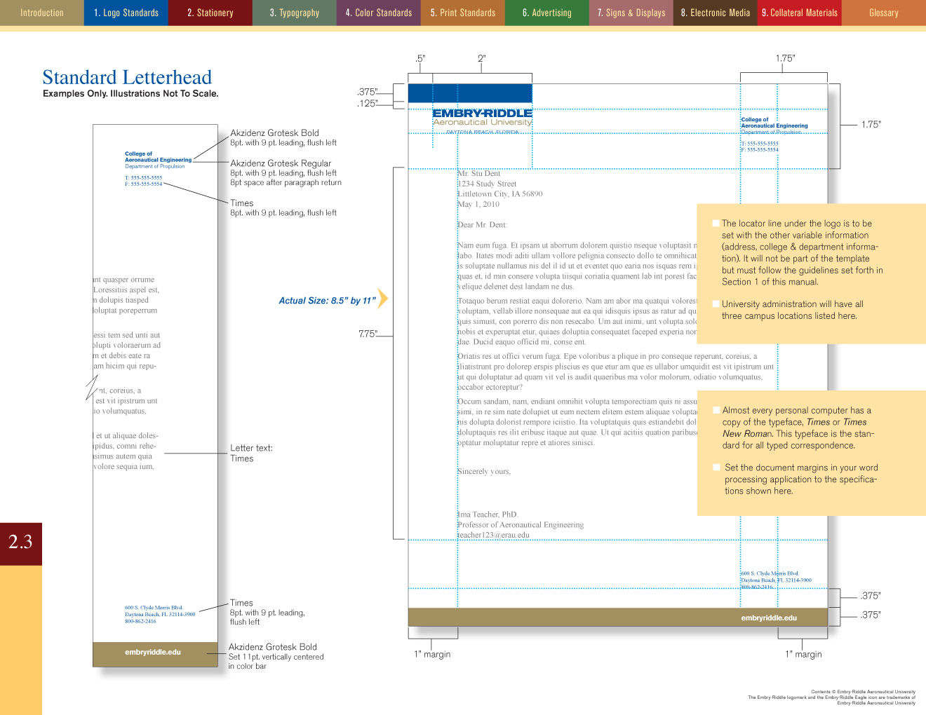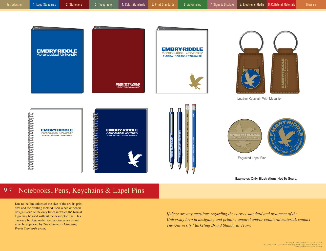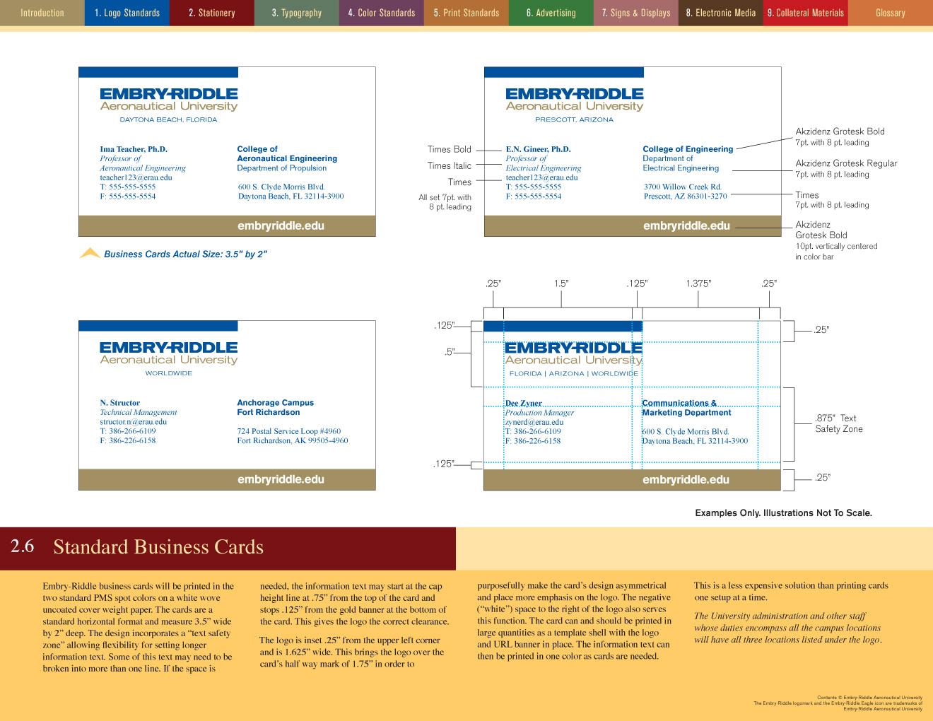 It took nearly three months to write and design the brand standards manual for Embry-Riddle Aeronautical University. At one point it was up to nearly 96 pages but after some judicious editing the client and I got it down to a mere 84. The manual was planned for both print—at landscape letterhead size—and as an interactive PDF. Clicking on the colored navigation at the top of the page jumped the reader to the first page of that section. The Table of Contents also provided click-through navigation. Below are just a few sample pages...