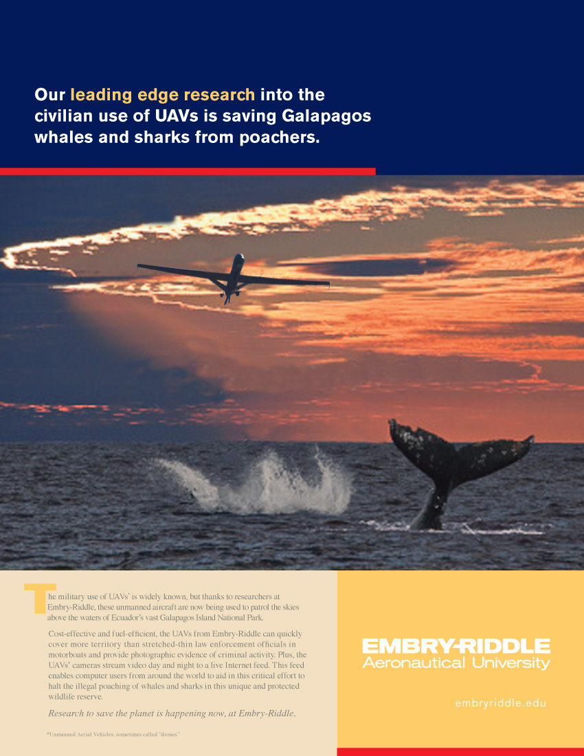 A series of three magazine ads for Embry-Riddle Aeronautical University. The concept was to show the university at the "leading edge" of technology education by presenting real life stories of current research projects at the school. By the way, the "drone" (UAV) was not being used to bomb poachers—just photograph them.