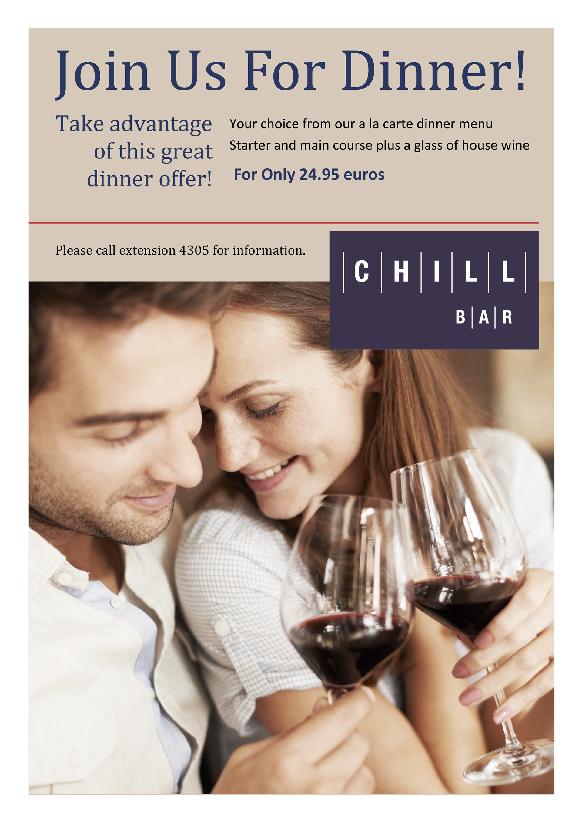 One of a series of posters for a bar at one of Marriott Vacations Worldwide European resorts. The design needed to be very simple as it was for a template created in Publisher for the client to edit on site. The text is limited to the default typefaces available on their PCs.