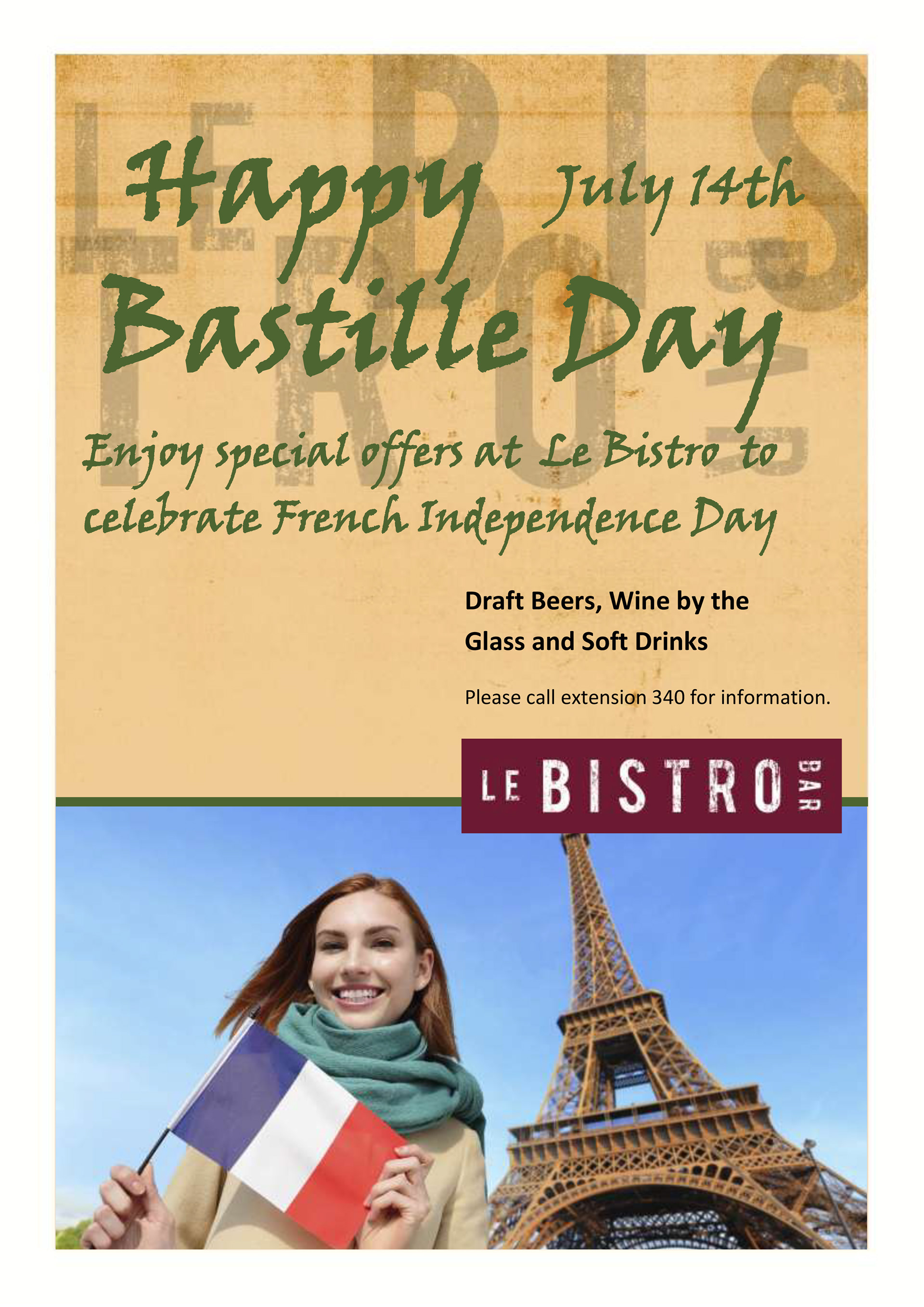 One of a series of posters for Le Bistro Bar in Paris. The design is kept simple as it is a template built in Publisher (yikes!) for the client to edit on site. The typefaces were chosen by the client to match the default faces they have available on their PCs.