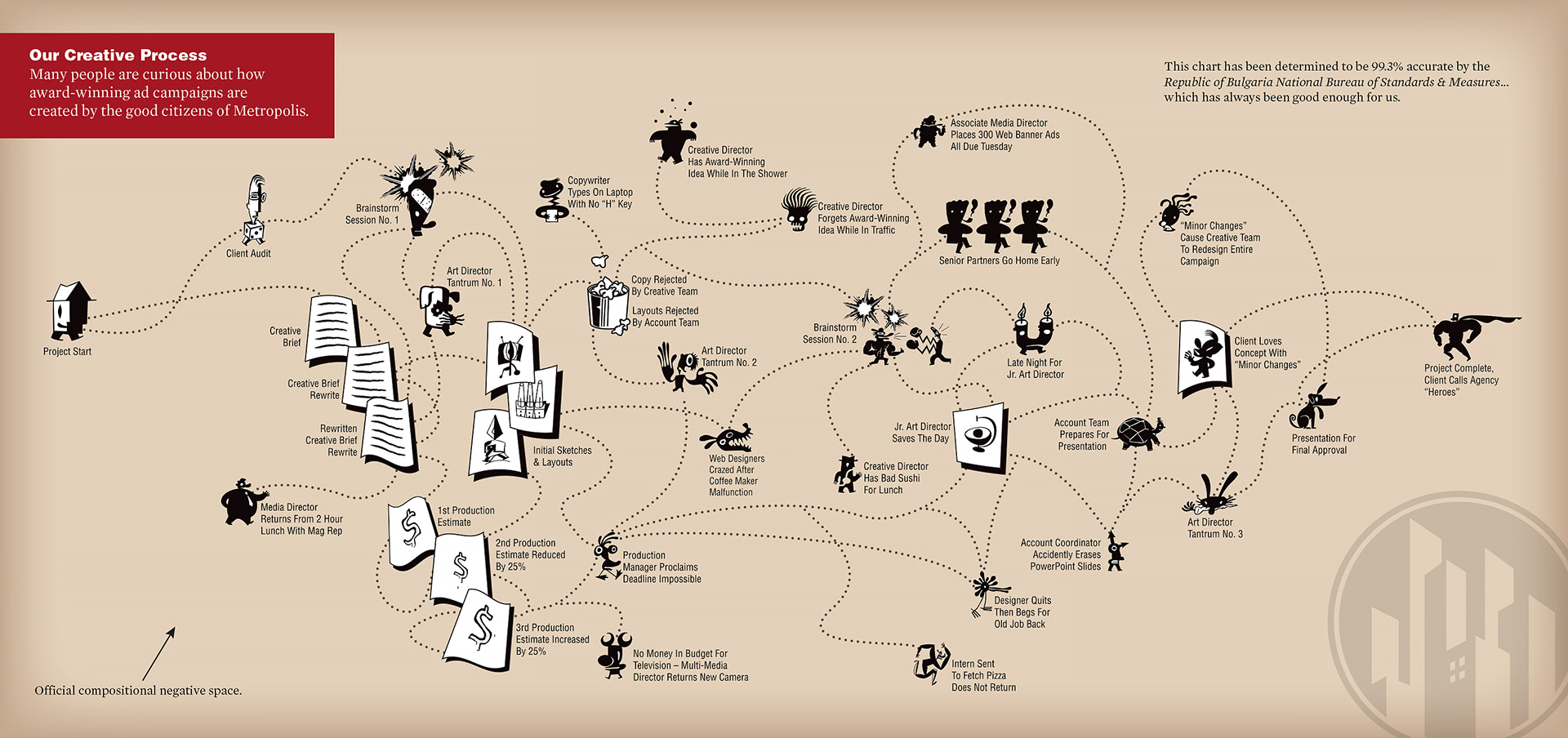 Satirical view of the ad agency's creative process using the ZeitGuys font as part of the illustration. This was a double page spread for a company brochure.