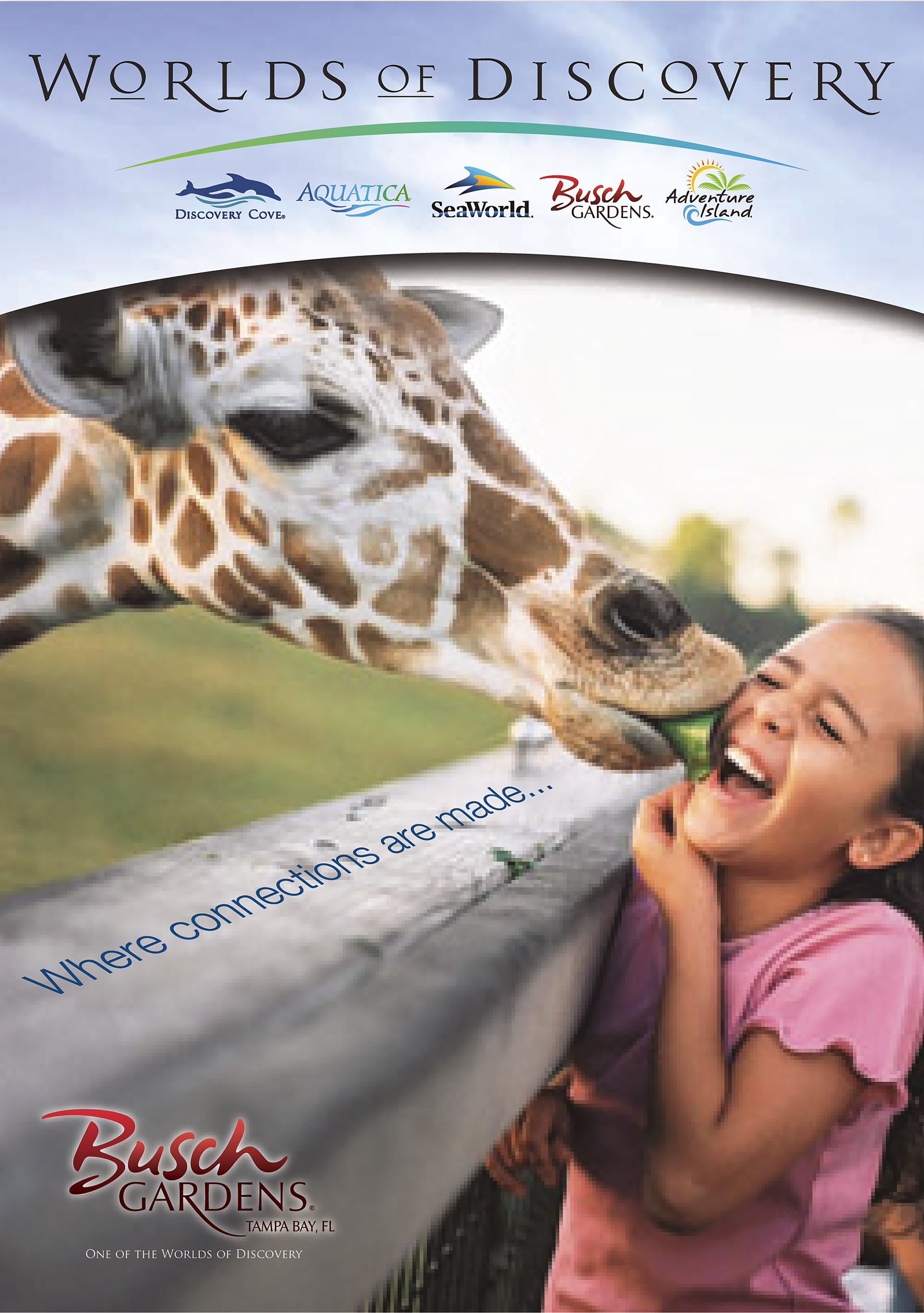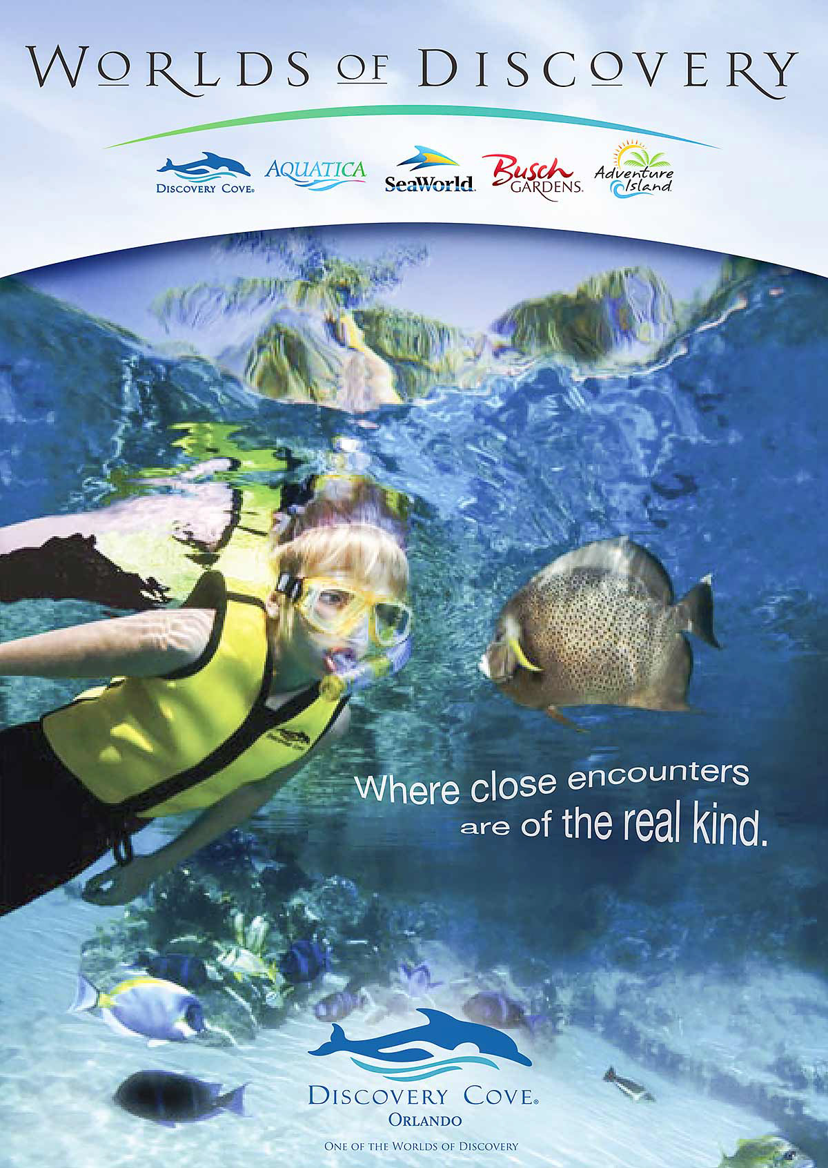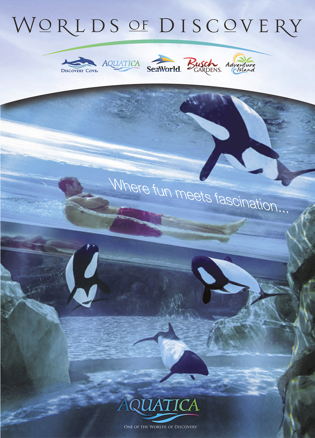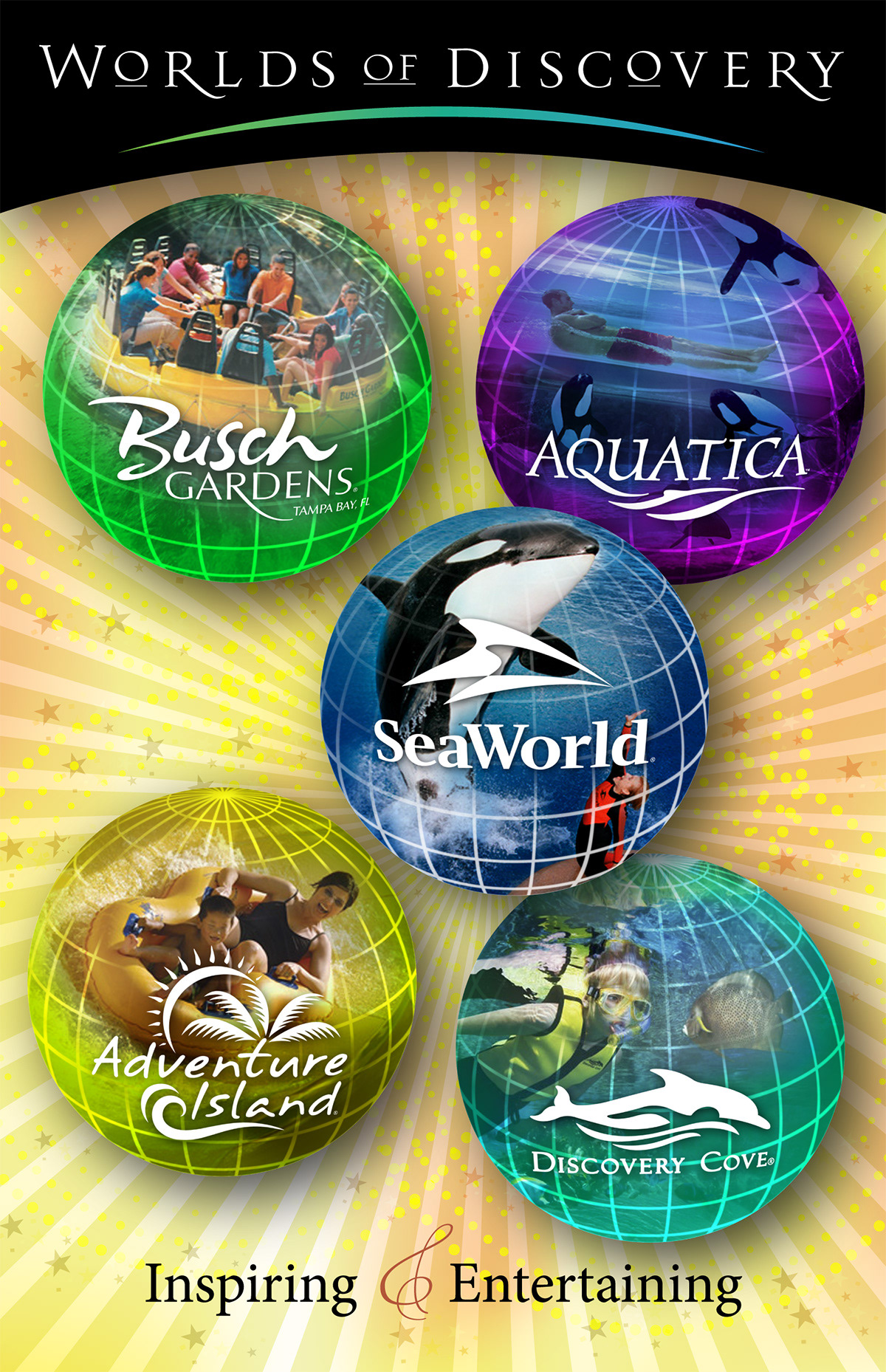 A small sample from a series of posters for the individual theme parks within the brand but with the Worlds of Discovery brand graphics as a header.