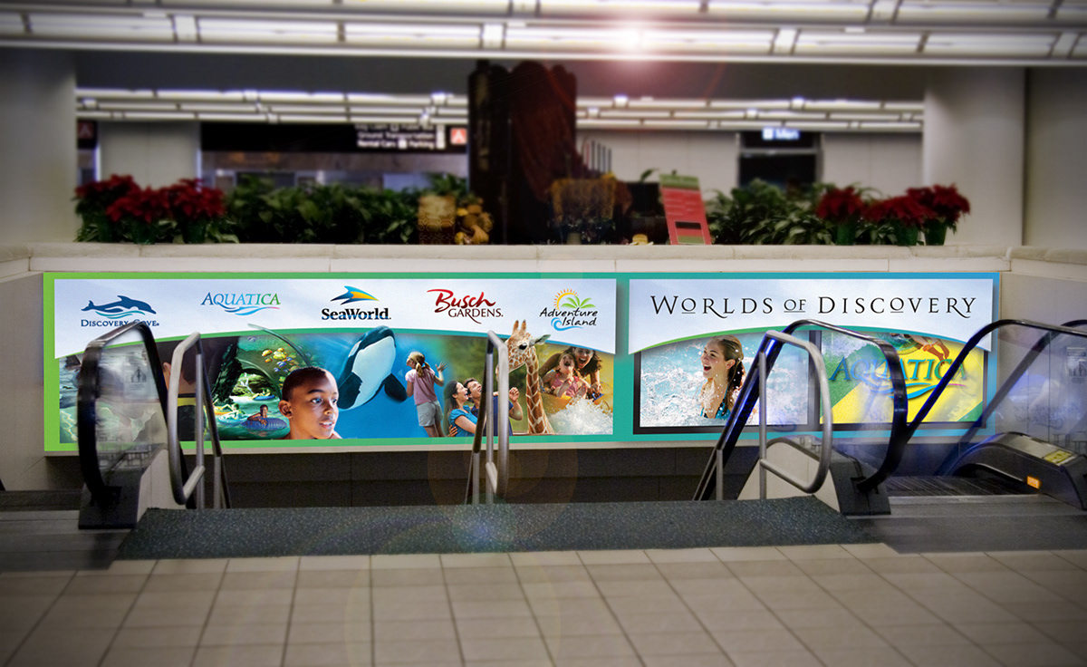 Located on the way to baggage claim at the Orlando International Airport, this display features a wide screen video monitor that ran a looped series of movies and images.